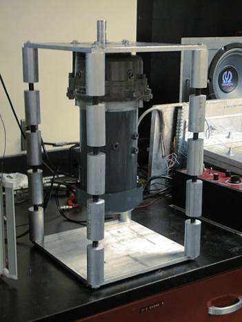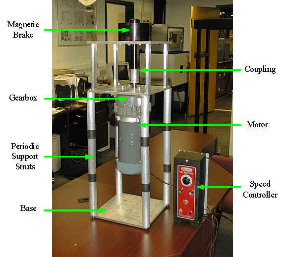 PERIODIC SUPPORT STRUTS A new class of support struts called periodic struts is introduced as an isolator of the vibration transmitted from Helicopter gearbox to the fuselage and cabin. It has been presented the innovative use of unique characteristics of periodic struts in controlling the wave propagation both in the spectral and spatial domains. The emphasis is placed on studying the dynamics of one-dimensional periodic struts in their passive mode of operation in order to demonstrate their unique filtering capabilities. Both experimental and numerical results are presented to demonstrate the effect in attenuating the vibration transmitted from gearbox to the airframe. The numerical results predict the stop bands associated with any struts configuration (Figures (1) and (3)). Such predictions are found to be in close agreement with the experimental results as shown in Figures (2). Active periodic is also introduces in order to tune the spectral width and location of the pass and stop bands in response to the structural vibration. These struts are conventional periodic struts augmented with built-in sensing and actuation capabilities in order to stop and confine the propagation of undesirable disturbances. Such active struts are utilized to control vibration transmission from a helicopter gearbox to the fuselage. Figure (1) The experiment setup of gearbox with periodic struts with material discontinuity
