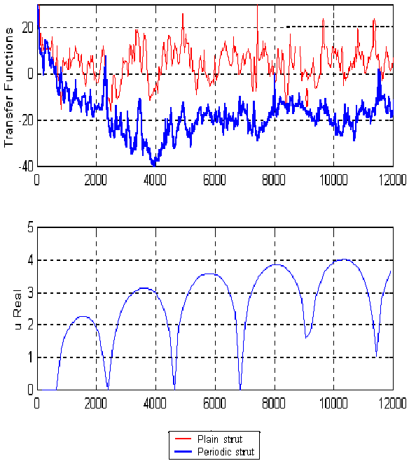 Its evident that periodic struts with material discontinuity can be vary effective in attenuating the vibration transmission over a broad frequency band. Increasing the length Lb of the material b insert (rubber) results in widening the spectral width of the stop bands.